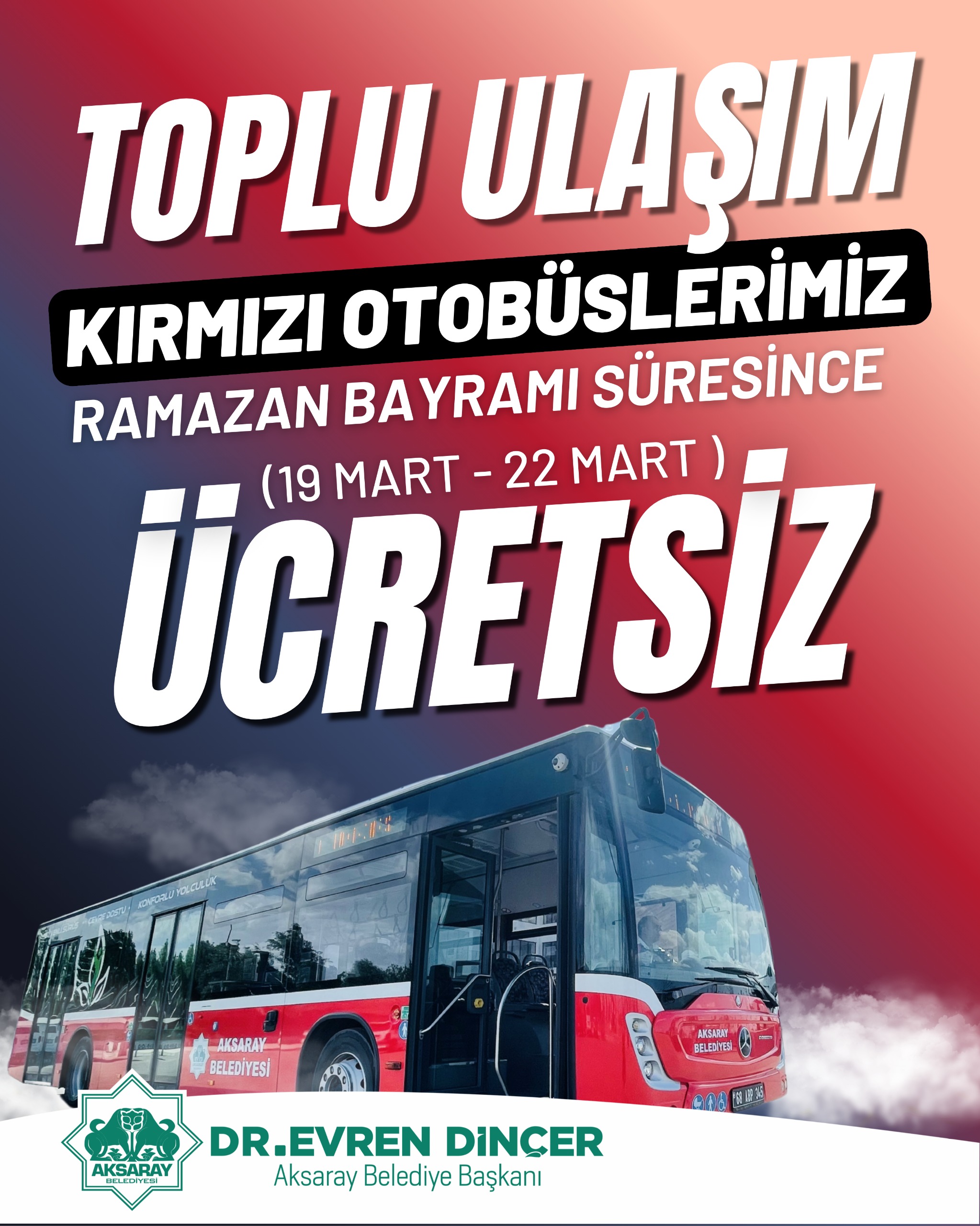 Aksaray Belediyesi, Ramazan Bayramı dolayısıyla toplu ulaşımda geleneksel hale getirdiği ücretsiz hizmet uygulamasını bu yıl da sürdürüyor. Belediye Başkanı Dr. Evren Dinçer’in talimatıyla, bayram süresince belediyeye ait kırmızı ...