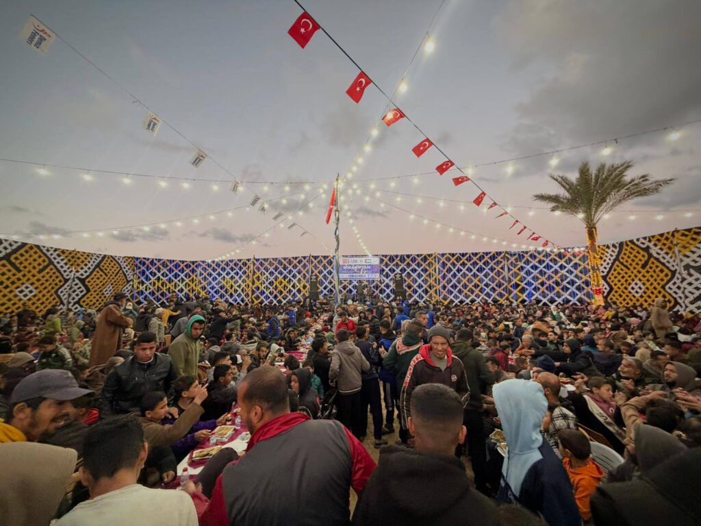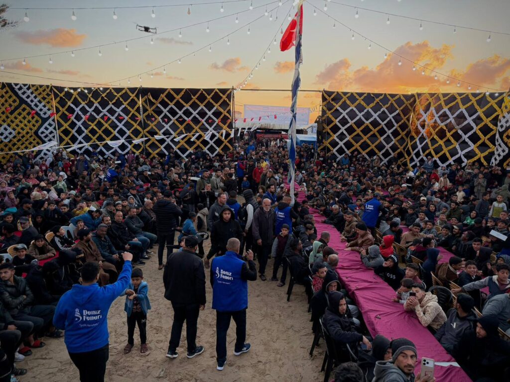 Gazze’de oluşturulan iftar programı çerçevesinde ihtiyaç sahiplerine düzenli olarak sıcak yemek ikramında bulunuluyor. Özellikle çocuklar, yaşlılar ve ailelerin yoğun katılım gösterdiği iftar buluşmaları, yalnızca günlük gıda ihtiyacının karşılanmasına katkı sunmakla kalmıyor; aynı zamanda Ramazan ayının manevi atmosferini güçlendiren bir dayanışma ortamı oluşturuyor.